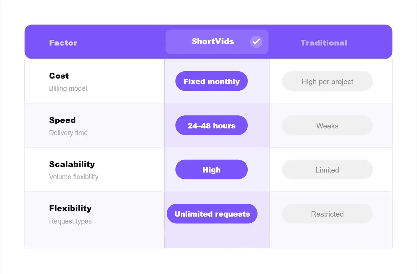 ShortVids offers scalable 3D animation with fast turnaround and a dedicated team. You don’t need to manage freelancers or agencies, making the process simpler and more efficient.