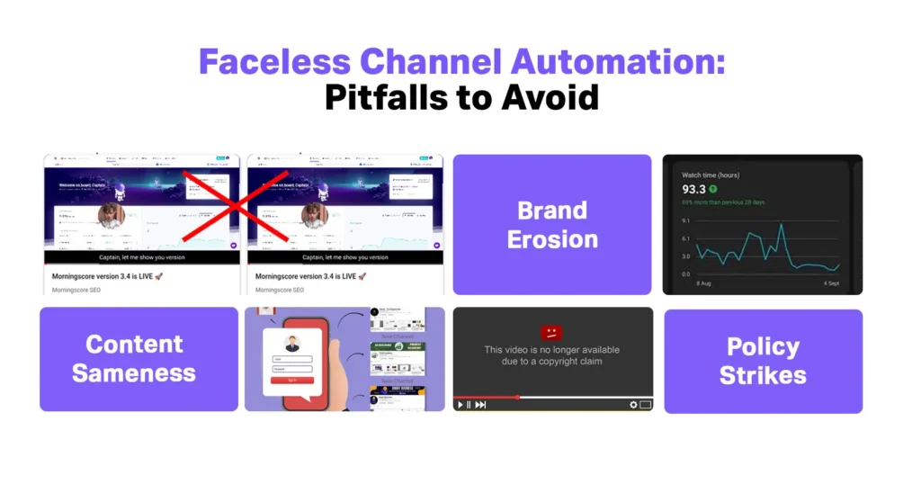 Automation can dramatically increase efficiency, but it isn’t without risks. Over-reliance on AI often leads to content sameness, where videos feel repetitive or formulaic, causing viewers to lose interest. Channels that ignore YouTube’s guidelines also risk policy strikes, which can limit reach or even result in demonetization.