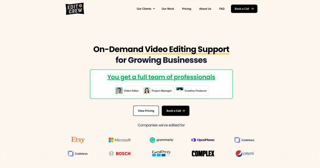Its editors produce social-friendly clips, reels, and long-form edits that fit the Brand Voice perfectly. Edit Crew is built for coaches, agencies, and entrepreneurs who need dependability. The combination of fast revisions and custom planning makes it an affordable video editing plan choice for creators who value control and timing. Few other professional video editing platforms adapt this quickly to feedback and project urgency.