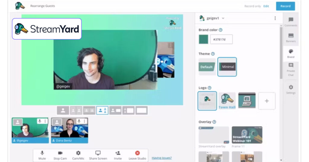 StreamYard has become a favorite for live video creators looking for studio-quality video recording software. It offers browser-based controls with recording and multi-streaming so creators can record while going live. The purpose is live event creation with simultaneous recording, which makes it perfect for video recording tools for YouTube and brand webinars where professional presence matters.