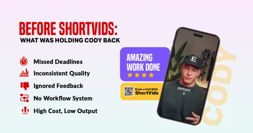 Balancing his personal brand with PARAFLIX wasn’t the issue; it was what happened in the background. Edits were falling behind, quality wasn’t up to the mark, and clients started to notice this, too. Before Cody with ShortVids became a thing, there were real challenges slowing him down. It wasn’t just frustrating; it was also costing him the trust of his clients.