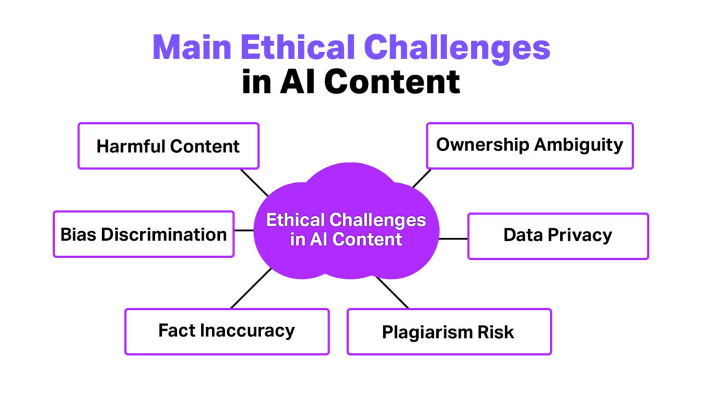 When using AI for content creation, ethical risks go beyond grammar or readability to other challenges. They affect brand reputation, legal compliance, and societal perception. Ignoring them can lead to mistrust, misinformation, or even legal consequences.