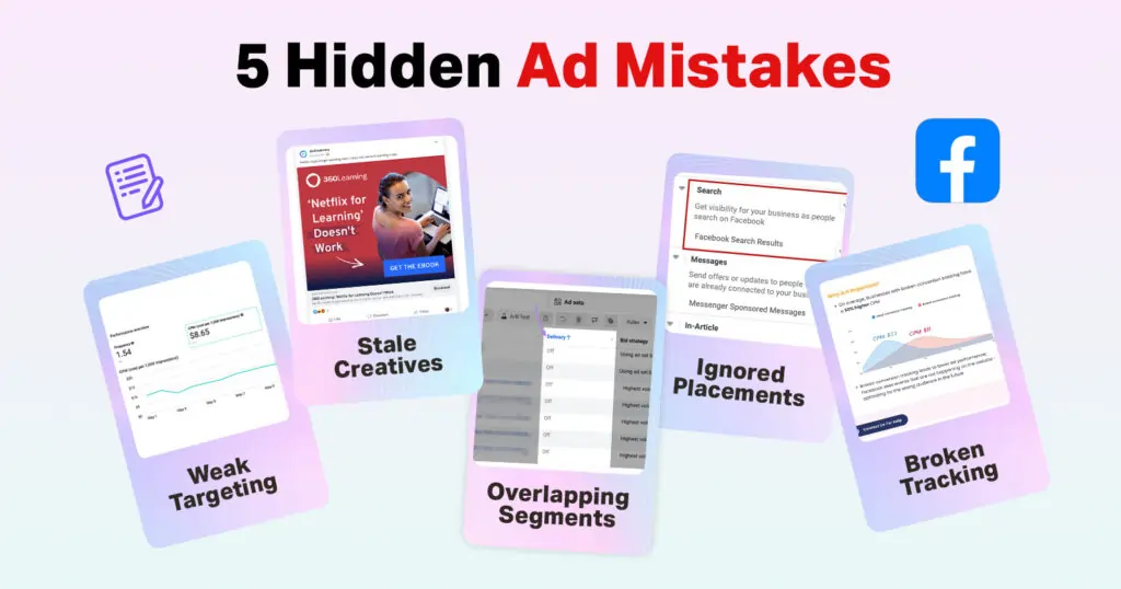 | Outdated Creative | Refresh visuals and copy every 2-4 weeks, use videos, new formats, CTAs, and A/B testing |