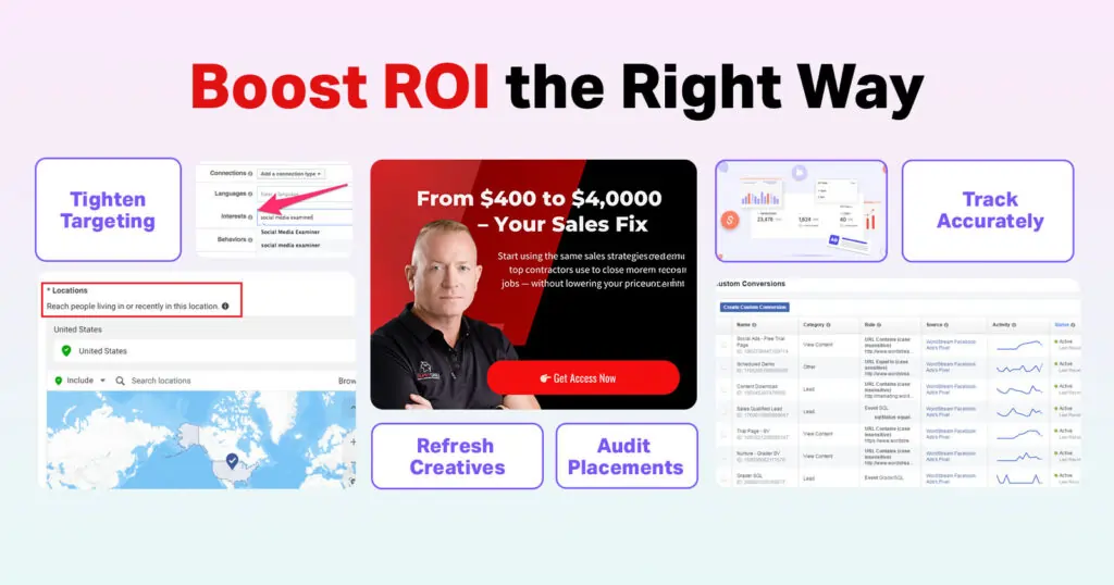 To increase ROI, sharpen audience targeting, refresh creatives regularly, perform placement audits, segment audiences clearly, and ensure accurate conversion tracking. These steps help improve Facebook ad ROI effectively.