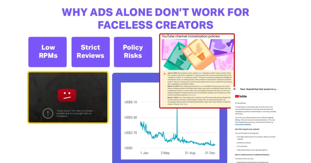 Relying only on ads is still one of the biggest mistakes faceless creators make. AdSense looks simple on the surface, but it’s one of the most unstable revenue models YouTube offers. Earnings depend on advertiser demand, regional CPMs, seasonal budgets, and policy enforcement, none of which creators control.