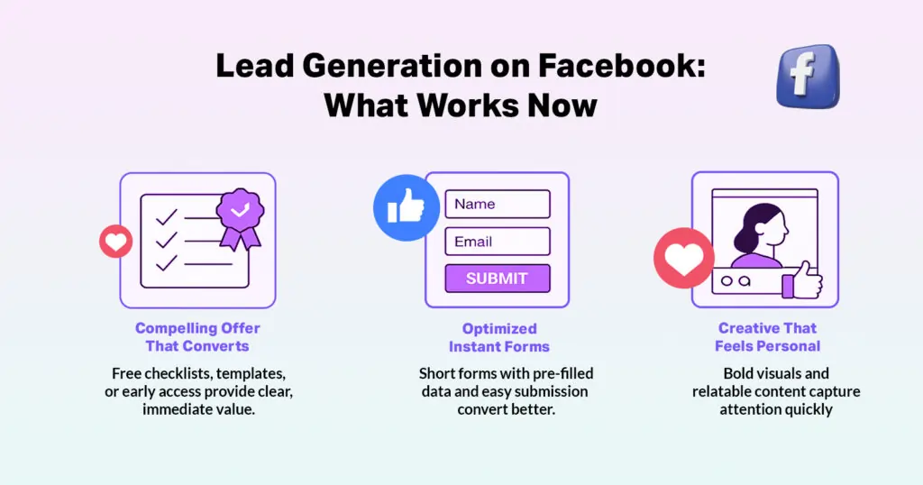 If your form has high clicks but low submissions, it’s time to fix it. Facebook lead form optimization means shorter forms, clearer headlines, and better mobile preview. Make sure the form looks easy and inviting on smaller screens. Small tweaks make big differences in conversions reducing a form from 4 fields to 3 alone can boost conversions by almost 50%.