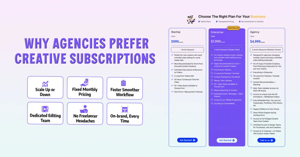Subscription with ShortVids means agencies get a dedicated video editing agency that understands their style and requirements. Unlike Freelancers, this partnership creates a reliable workflow, saving agencies from the hassle of constantly re-educating new editors or risking delays in content delivery. This deep collaboration results in faster turnaround and brand consistency.