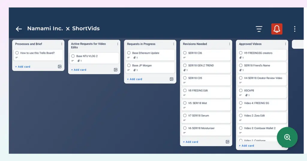 Namami uses Trello to assign every video project. Each card holds the daily requirements, creative guidelines, and raw files, so nothing gets missed and priorities stay clear.
