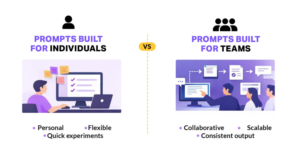 Personal prompts usually rely on context only, you know, change frequently, aren’t documented, and often produce inconsistent results. They work for experimentation or individual creators, but break down in team settings.
