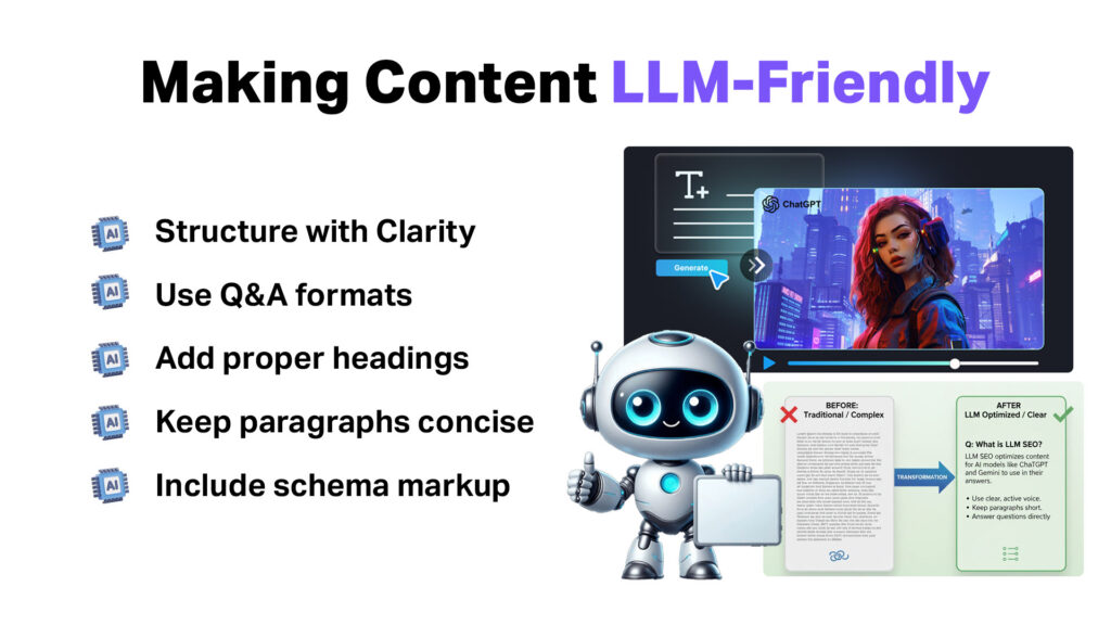 - How to create LLM-friendly content: Clear hierarchies → Question-answer structure → Concise paragraphs → Lists and bullets → Schema markup.
