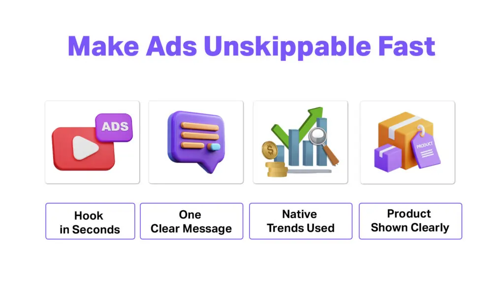 Build short-form video ads around a bold visual, a relatable problem, a quick solution proof, and a punchy CTA.
