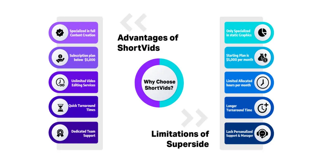 ShortVids is specially made for video editing with a dedicated 24/7 team, while Superside focuses on broad creative services like branding and graphic design. If video is your main priority, ShortVids is the better fit.