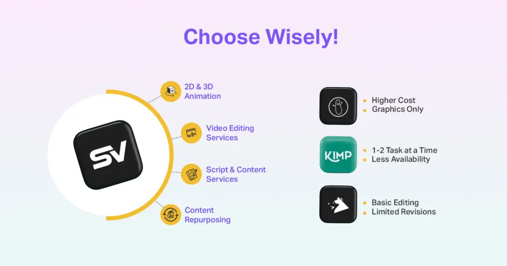 ShortVids stands out by combining speed, quality, and personalized service in one package. Unlike some other agencies you may have heard of, like Kimp, Design Pickle, or Video Husky. ShortVids focuses on a seamless, creative partnership that grows with your business.