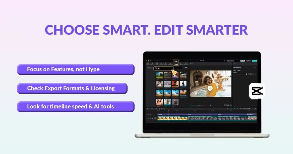 Choosing video editing software under $100 is not just about the price. You need a tool that works well for you, gets the job done reliably, and can grow with your needs. Below, I will discuss the practical criteria that separate useful budget editors from frustrating ones. Think of this as your buying checklist. Focus on features that save you time, important quality checks, and contract items that protect your work.