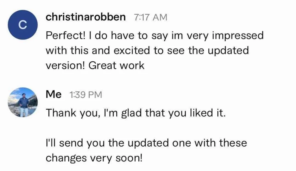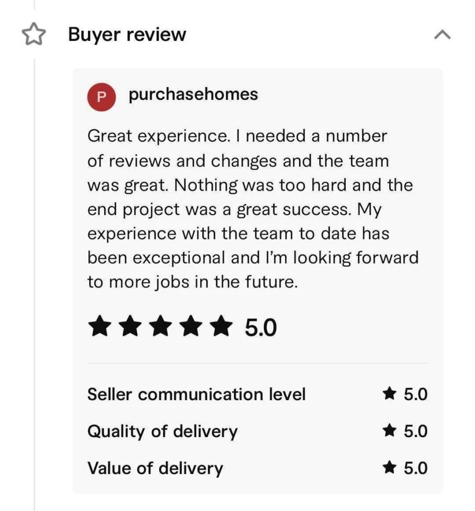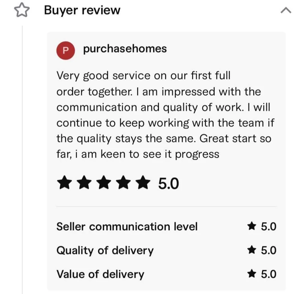 Good communication, great adjustments on revisions and a seriously solid overall product. I’m very likely to buy again on a recurring basis.