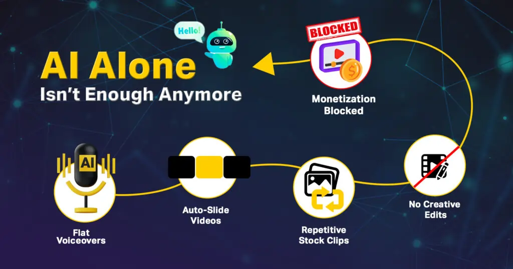Here’s the thing AI is fast, but it’s not foolproof. Platforms like YouTube have already started Demonetizing AI Content that looks mass-produced or lacks any human touch. If you’re relying on faceless videos, robotic voiceovers, or Avatar-Based Content, you’re probably setting yourself up for a future takedown. And guess what? More platforms are already preparing to follow the same path.