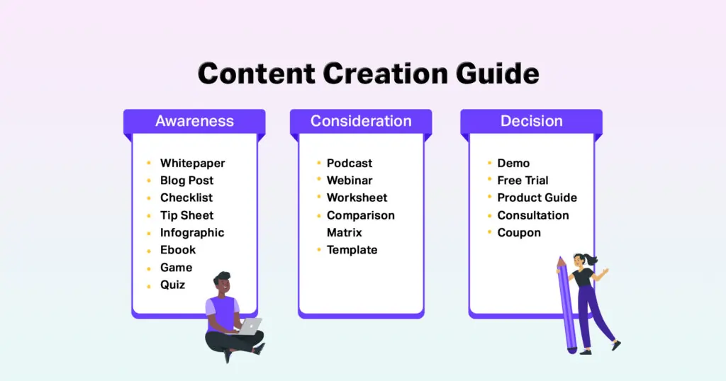 The best types depend on your audience but usually include blog posts, videos, visuals, podcasts, and interactive content. Each format supports different stages of the funnel and shows the importance of content creation across your customer journey.