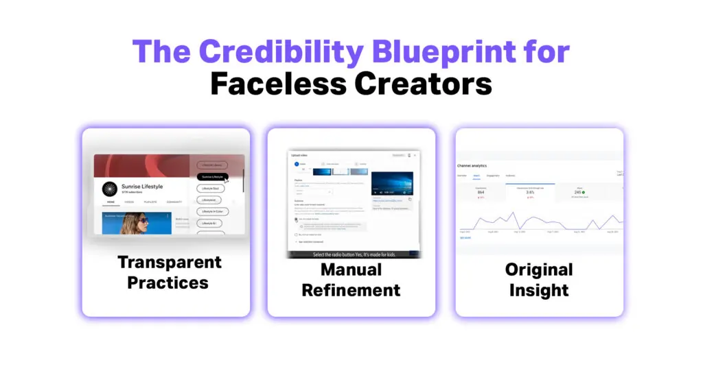This is where many faceless creators stumble: they assume that hiding their identity allows shortcuts. The truth is, credibility depends on intentional, high-quality execution, not visibility. A successful faceless channel requires clear ethical practices and thoughtful AI use.