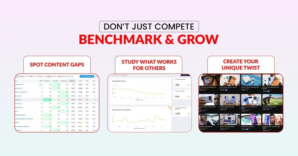 Monitoring your own metrics is crucial, but observing successful competitors can drive faster growth. Competitor benchmarking helps you find content gaps, gain inspiration, and understand your channel’s position in the larger landscape.