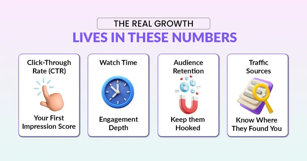 - Click-Through Rate (CTR) – how often people click after seeing your thumbnail